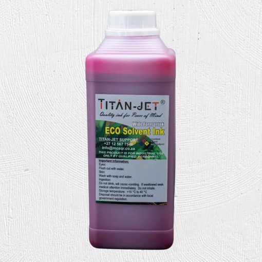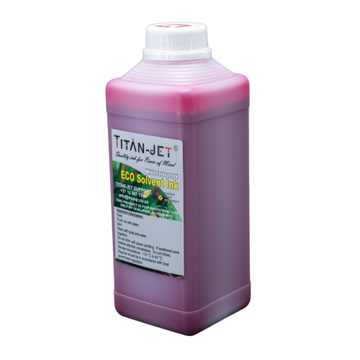 TitanJet Eco-solvent ink is a replacement ink for TitanJet wide-format solvent printers. Users can simply pour the ink into their printers when their current ink levels are low and there is no need for flushing or new color profiles thanks to TitanJets perfect color match. TitanJet Eco-solvent inks offer outstanding performance and value for your printing needs.